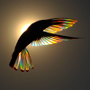 Description: a hummingbird hovers directly before the sun, turning its transparent feathers to rainbows